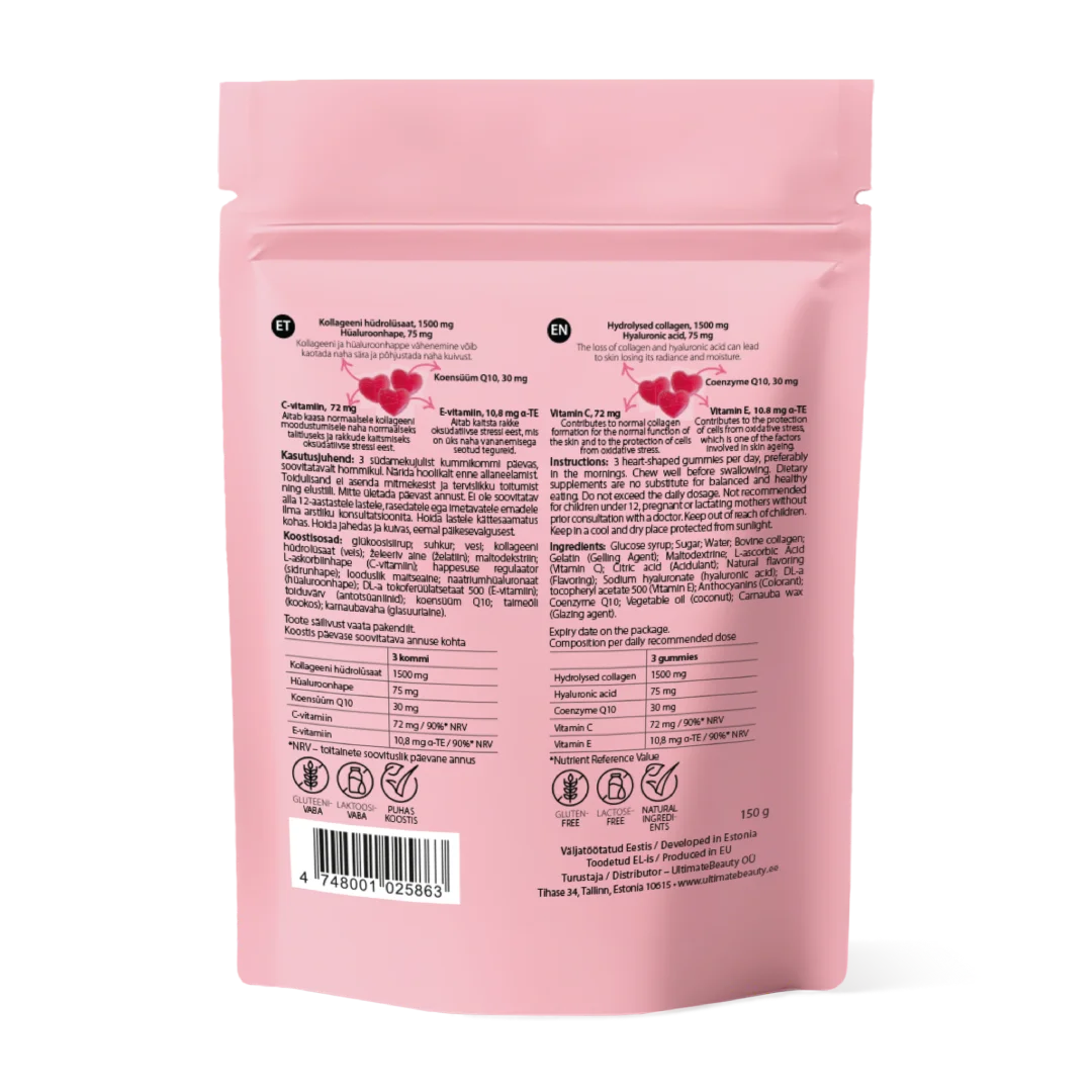 Ainesosat: glukoosisiirappi, sokeri, vesi, kollageenihydrolysaatti (nauta), hyytelöimisaine (liivate), happamuudensäätöaine (sitruunahappo), maltodekstriini, L-askorbiinihappo (C-vitamiini), happamuudensäätöaine (sitruunahappo), luontainen aromi (kirsikka), D-L-a-tokoferyyliasetaatti 500 (E-vitamiini), väriaine (antosyaniinit), koentsyymi Q10, kasviöljy (kookos), pintakäsittelyaine (karnaubavaha).
